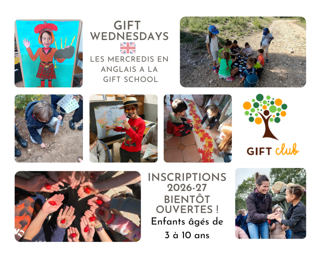 La Gift School propose un programme periscolaire en anglais, tous les mercredis de l’année scolaire. Ces activités sont organisées par groupes de 8 à 12 enfants et encadrées par un(e) enseignant(e) anglophone pour les enfants de 3 à 10 ans. Il s’agit d’apprendre l’anglais par l’immersion, au travers d’activités telles que le théâtre, le chant, les jeux, les activités physiques et artistiques et la cuisine.