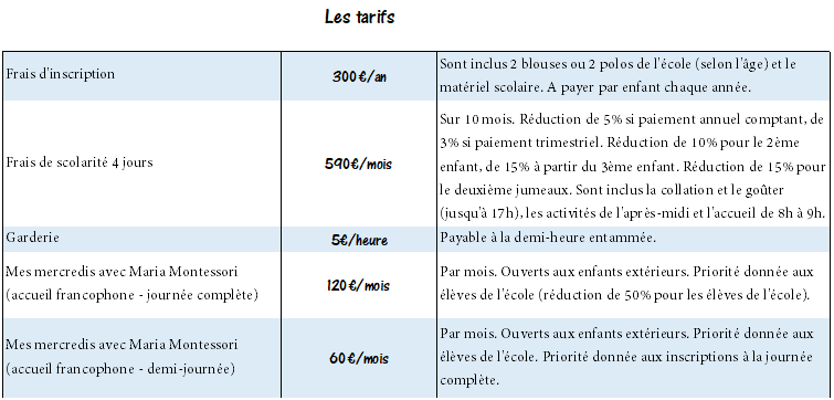 Tarif élève école : 200€/mois la journée complète et 120€/mois la demi-journée.