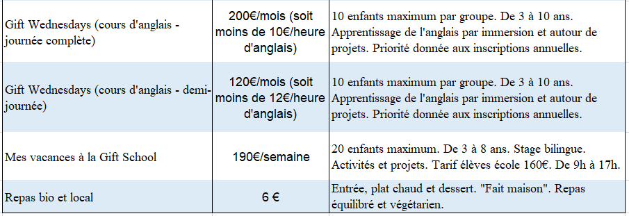 Mes vacances à la Gift School – Stage bilingue : 240€/semaine + 30€ d’inscription annuelle